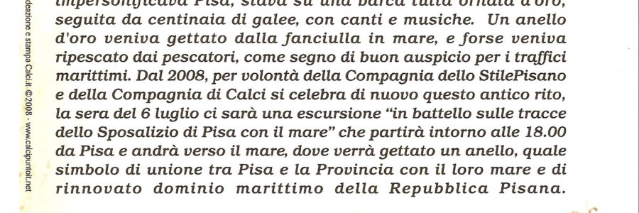 La prima edizione dello Sposalizio del Mare รจ avvenuta il 6 luglio 2008, grazie all’interessamento congiunto delle associazioni Compagnia di Calci, Amici di Pisa e Compagnia dello StilePisano che, sulla base degli scritti di Emilio Tolaini, ritennero opportuno e dovuto far conoscere questa antica tradizione ormai scomparsa.